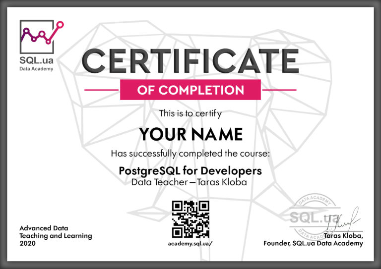 Успішне проходження онлайн-курсу по будь-якому з обраних пакетів навчання підтверджується сертифікатом SQL.ua Data Academy.